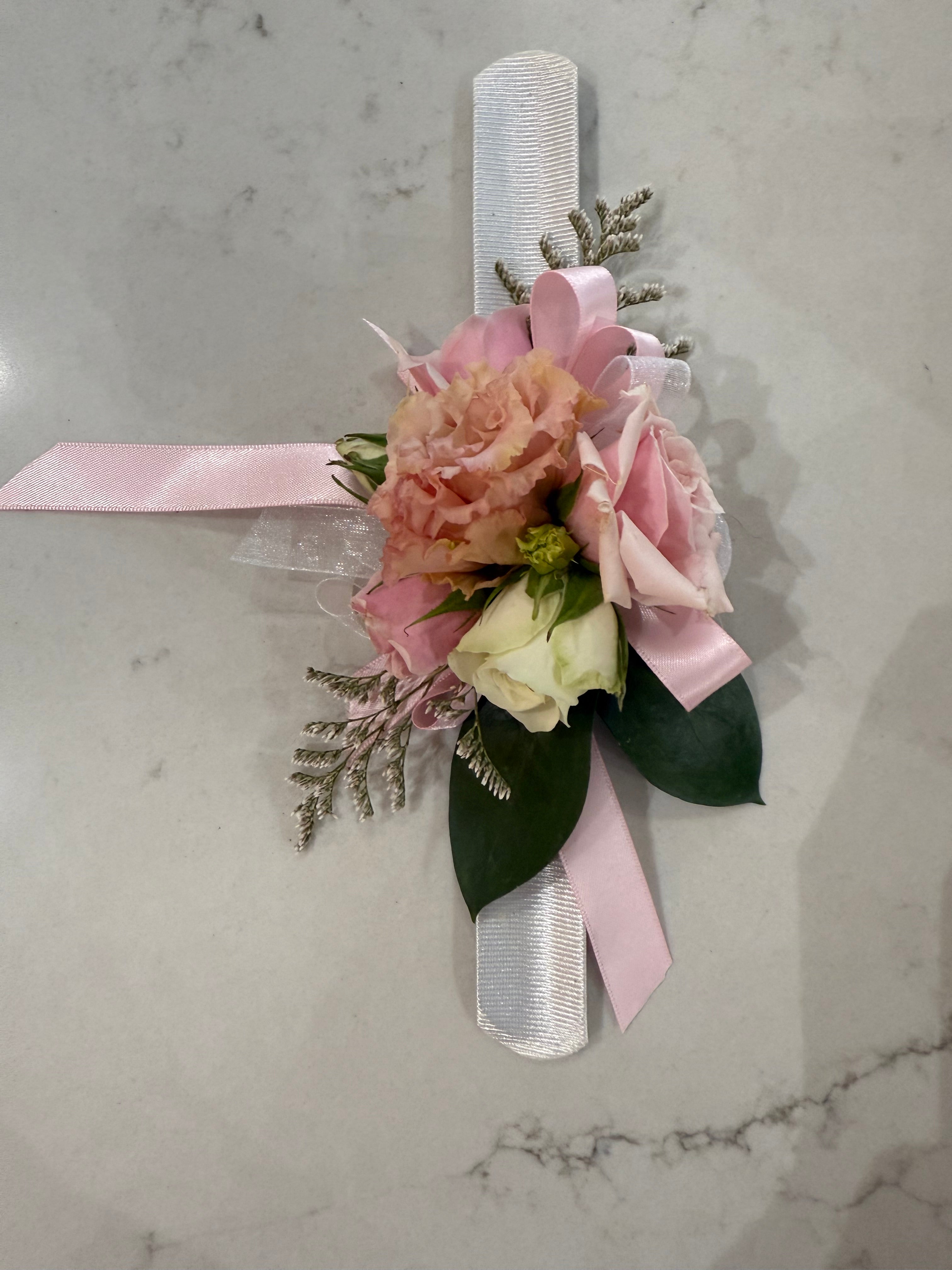 A lovely one-of-a-kind wrist corsage created just for you.  Our wearable flower art is always rich in texture, unique in design, appealing to the eye, sturdy and comfortable.