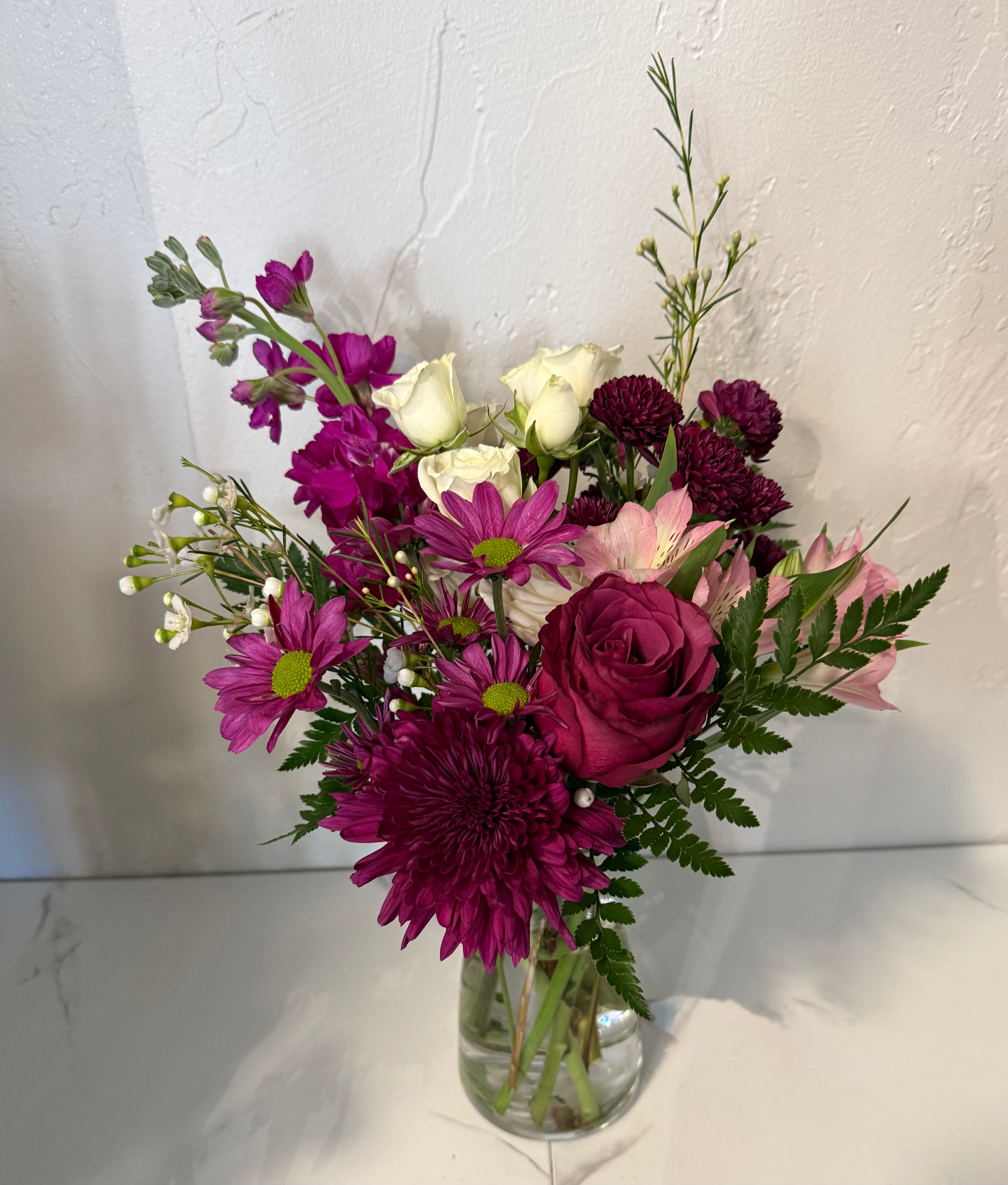 This petite arrangement makes a big statement. A perfect size for a nightstand or end table, this lovely lavender arrangement will remind that special someone that you’re thinking of them. Color and styles may vary slightly due to seasonal availability.