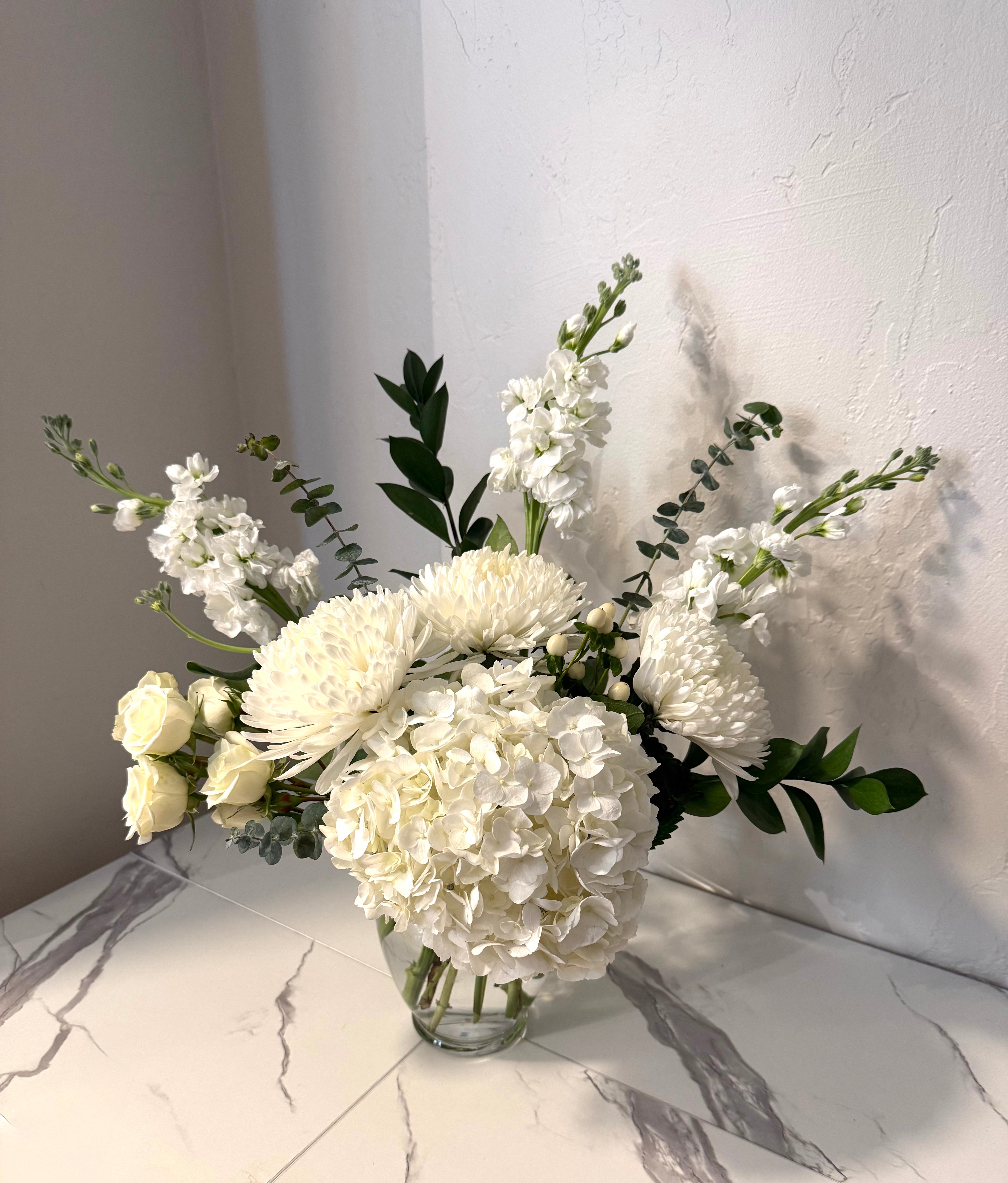 Perfectly Peaceful is a serene and elegant arrangement designed to bring comfort and calm. A soothing blend of all-white blooms-featuring lush hydrangea, fragrant stock, classic cremone mums, a delicate spray rose and soft touch of hypericum berry-is artfully gathered among fresh greenery. The gentle texture and pure palette create a sense of quiet beauty, making it a meaningful peaceful reflection or expression of remembrance.