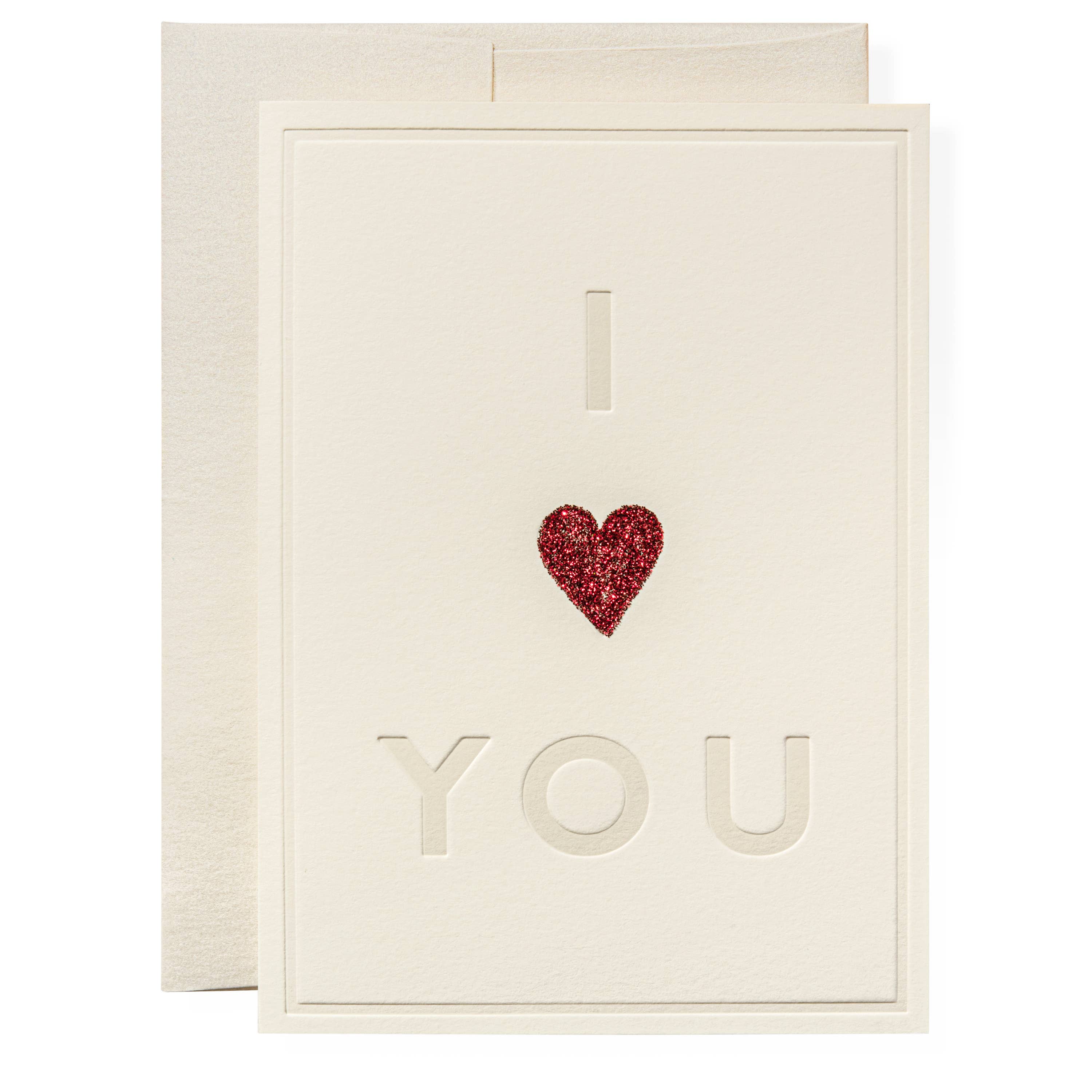 Our I Heart You greeting card is printed in memphis, tn. Full color ink printed on natural white paper, letterpress printed, hand-glittered, and paired with a quartz envelope. Book folded card, blank on the inside.
