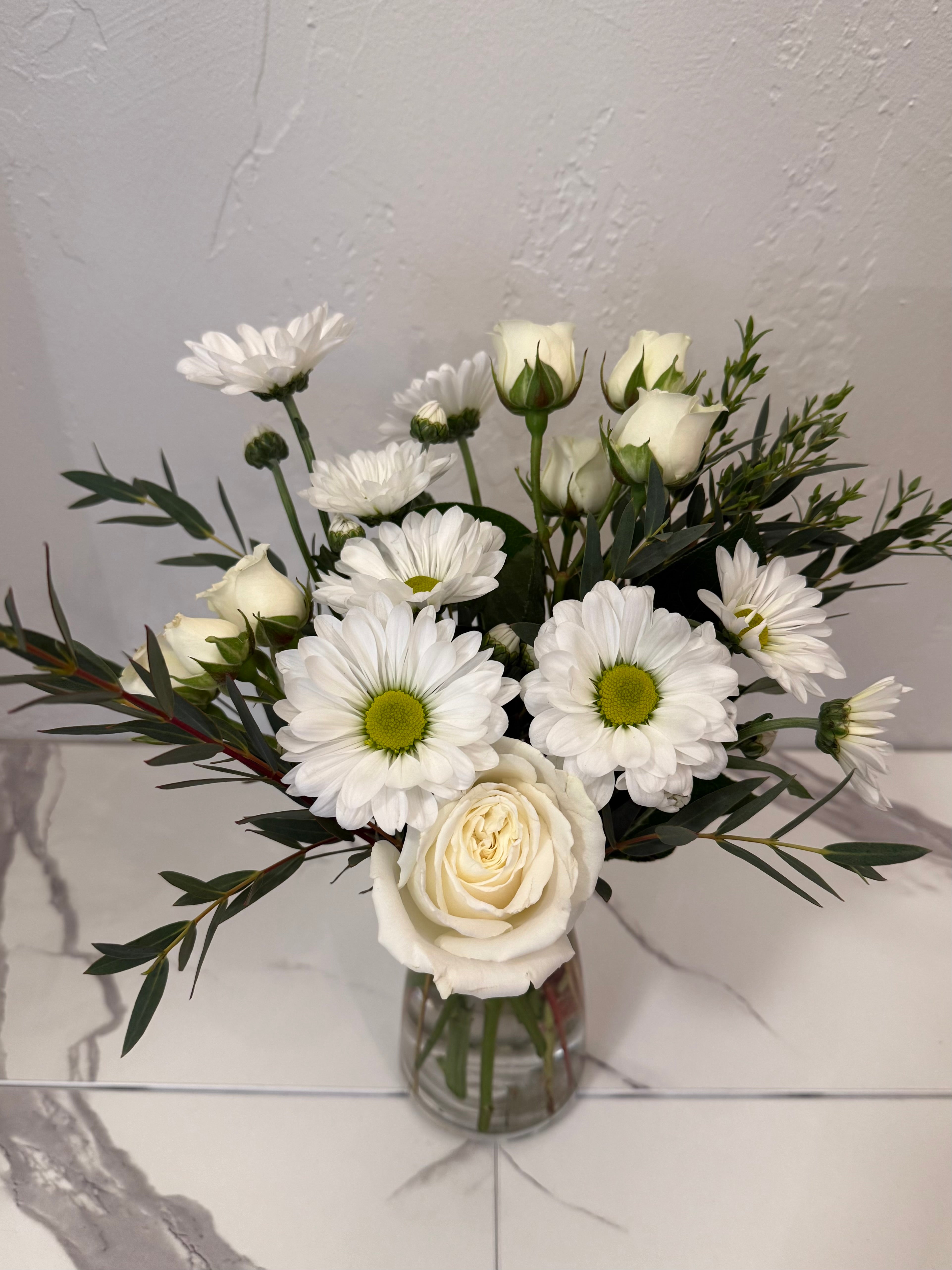 Daisy's and delicate spray roses combined with greens and a beautiful white rose