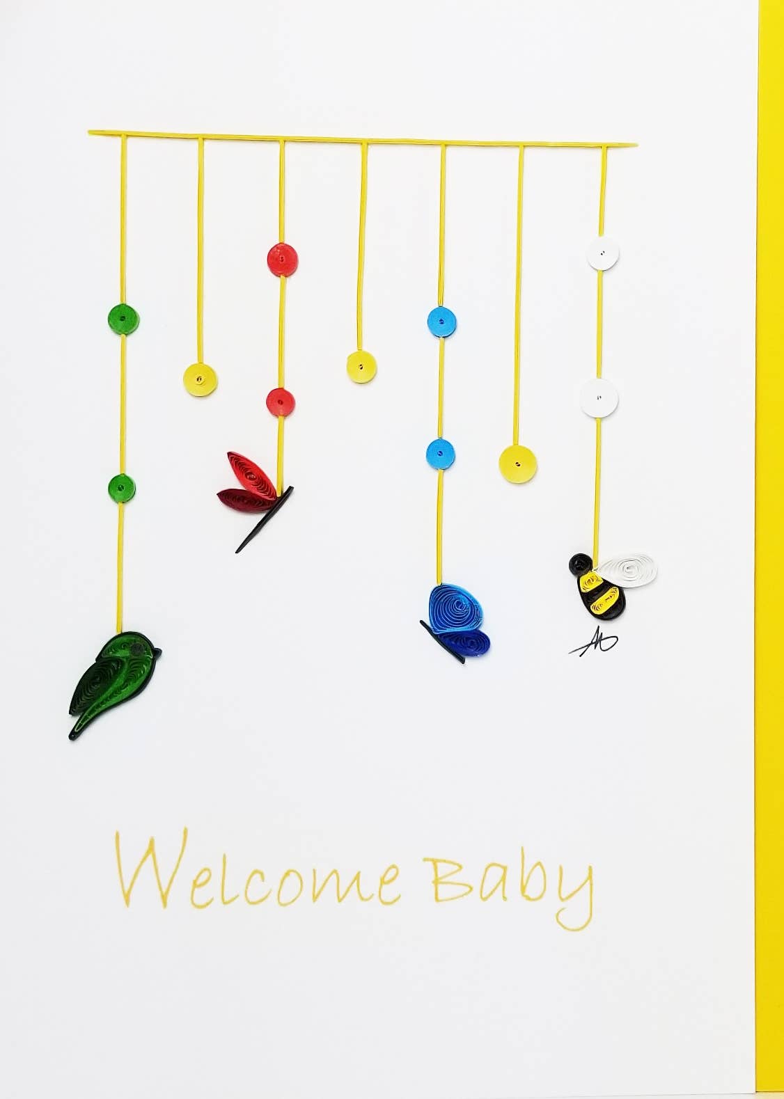 Celebrate the joy of a new arrival with Iconic Quilling's #406 "Welcome Baby" card. This hand-rolled paper greeting card, meticulously crafted by Aaron and Anh, is the perfect way to share your excitement and congratulations. Each card is a testament to their passion for creating beautiful, colorful images that bring smiles to faces. Send your best wishes with this unique, artful piece.