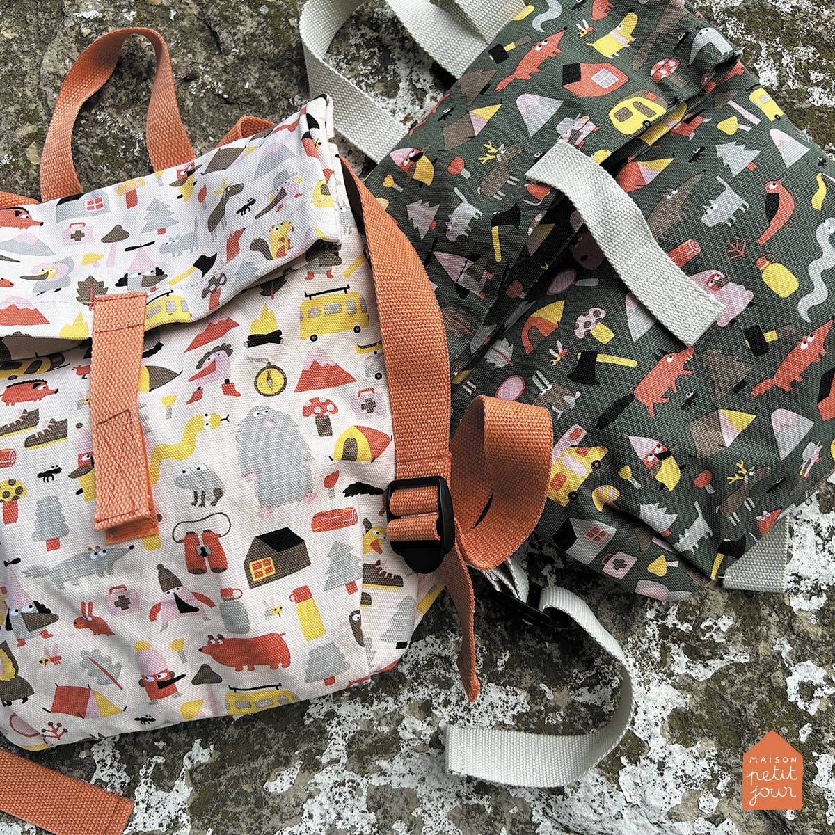 A cotton backpack to transport toy cars, colouring books, a change of clothes or plushies! Ultra light, practical with a simple flap and a velcro ribbon to close it.