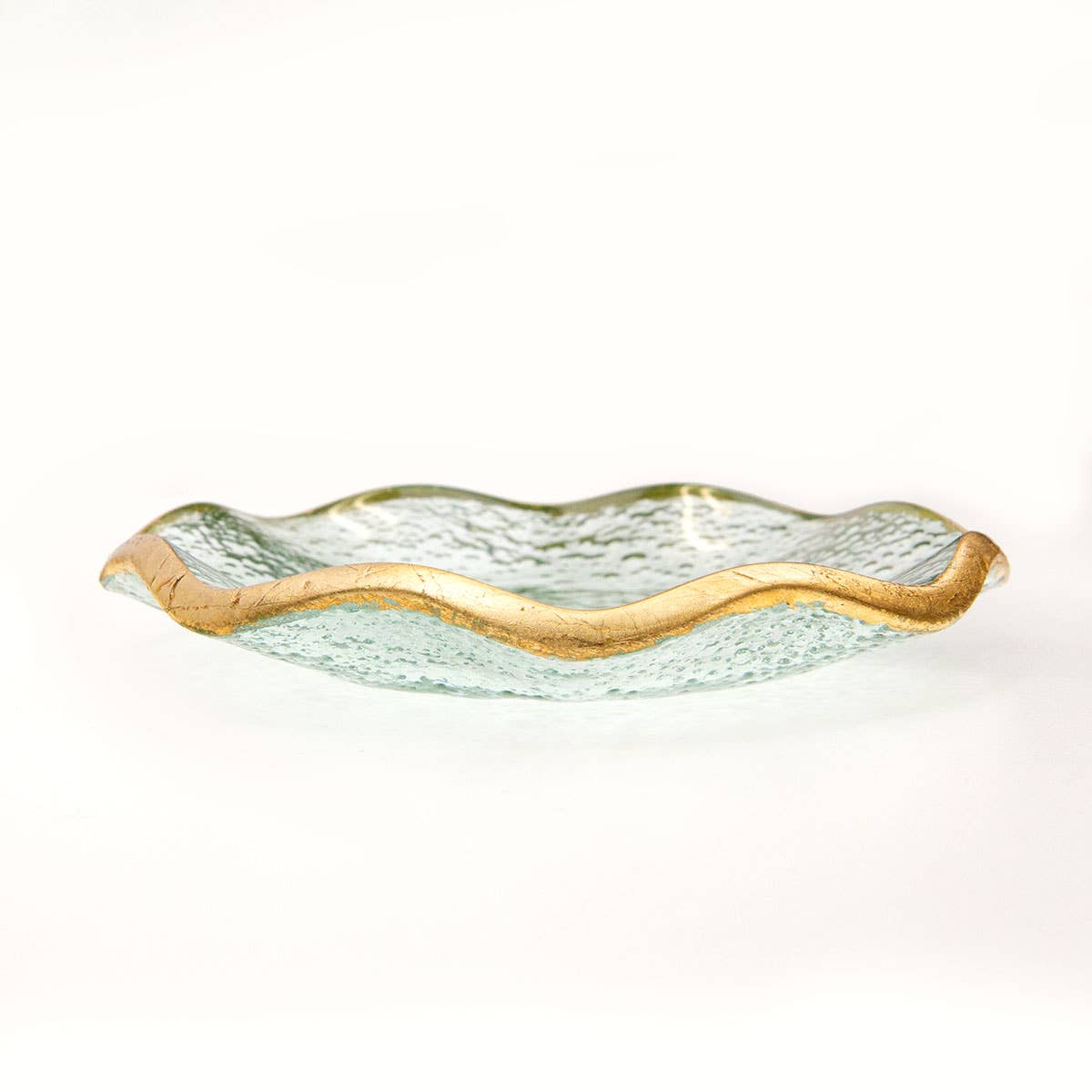 Our Austria Glass Trinket dish is beautifully detailed with a bubbled glass textured trimmed with a gold border. This item is perfect for holding jewelry, soaps, and other small items. Search Keywords: GLASS