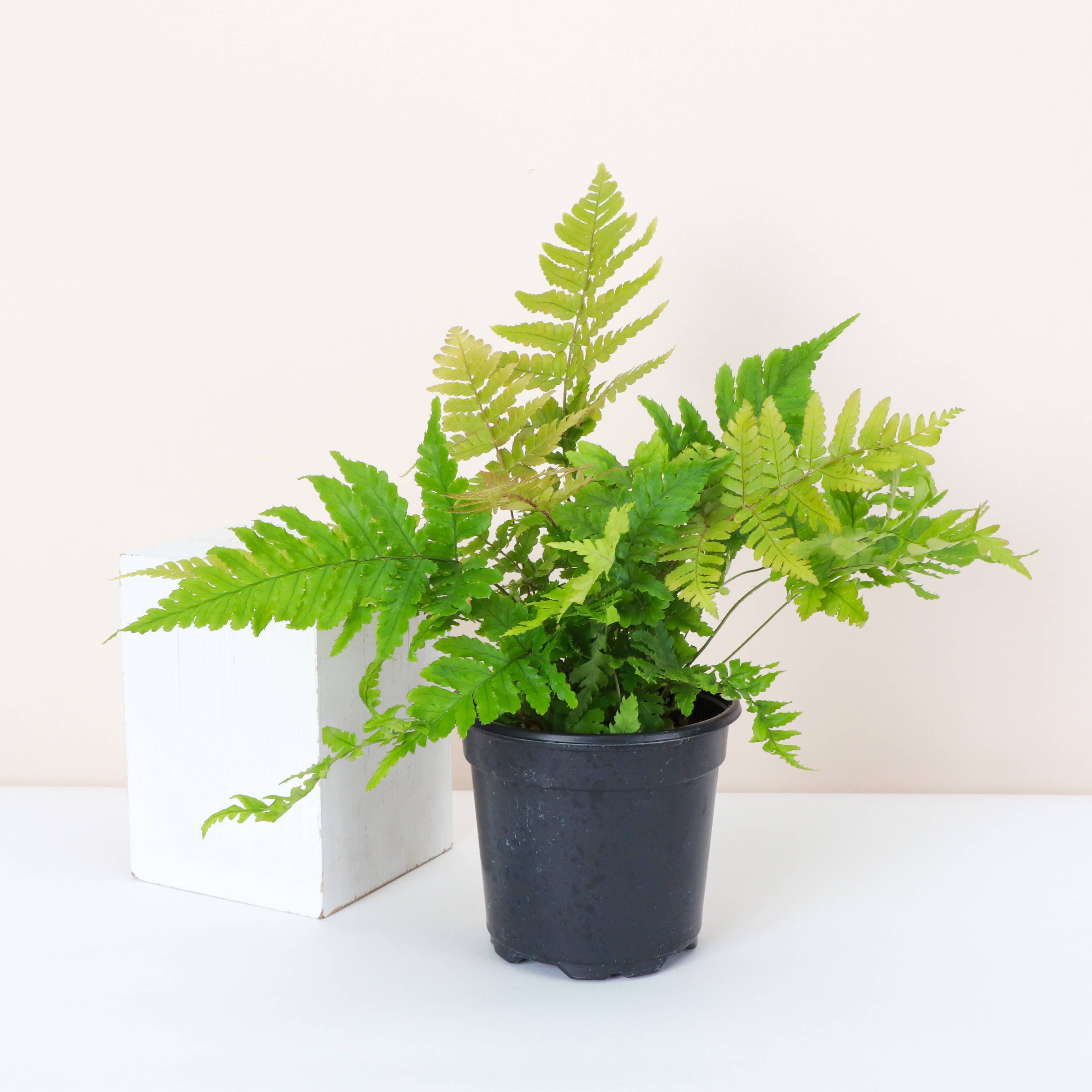 Botanical Name: Dryopteris erythrosora. Thrives in medium sunlight. This plant will arrive in a 4" diameter plastic growers pot with drainage holes. Pot color may vary. Height will range from 5-8" tall. Decorative pots not included.