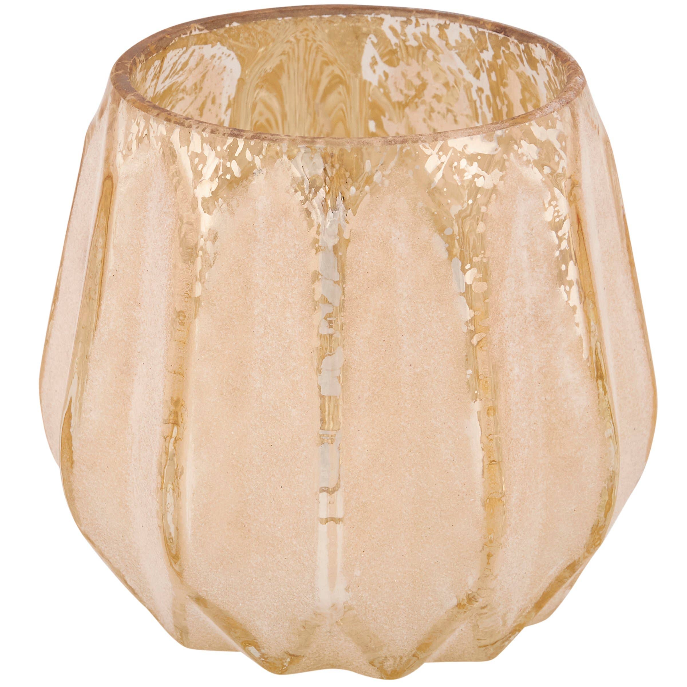 A glass candle holder from our Fall & Harvest Collection. Candle holder displays a blush inspired gold color with frosted and fleck accents. Our Blush Gold candle holder includes space inside to place a votive candle. Candle pictured not included. Perfect for a stylish seasonal home accent that adds natural lighting to any living space.