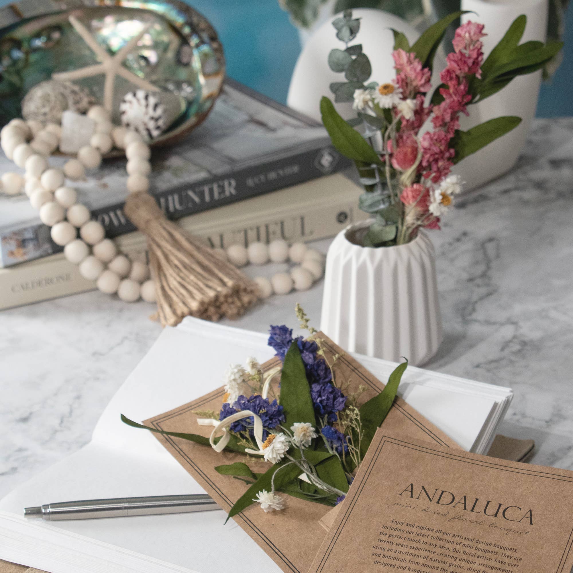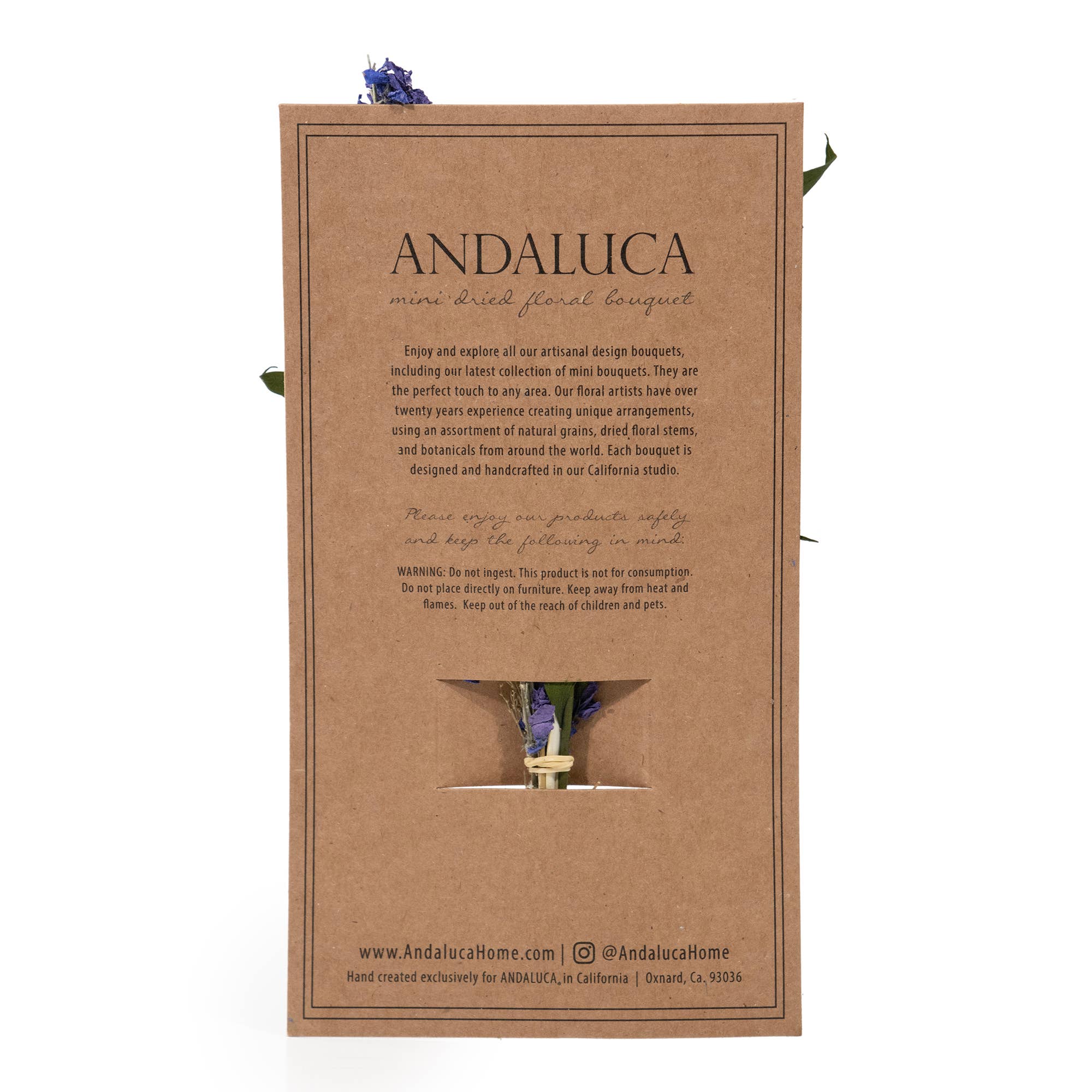 Our floral team designed this beautiful MINI bouquet using an assortment of baby eucalyptus, willow, and purple larkspur to create this charming and petit mini bouquet arrangement. Each bouquet is designed and handcrafted in our California design studio and is a perfect decorative accent to your tablescape or vignette. - 8" long - Comes in packs of 6. - Each bouquet is placed in a decorative paper card.