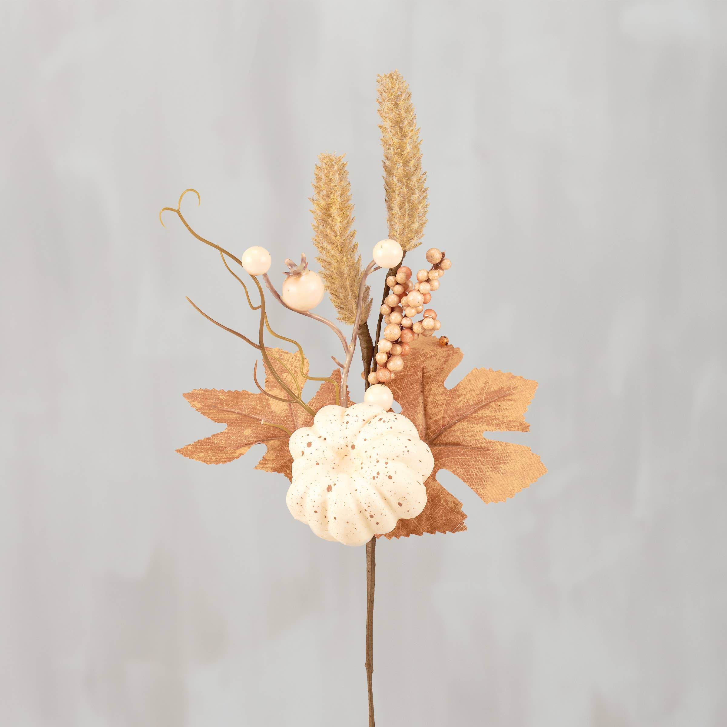 A pick of a white pumpkin accented with fall foliage perfect for adding to a seasonal vessel. Faux plants bring botanical vibes to any space with zero maintenance. Pair with other faux botanicals to create a rich, natural display without the worry of withering away. Our Fall Pumpkin pick stands 11.75 inches tall and complements well with décor from our Fall & Harvest Collection.