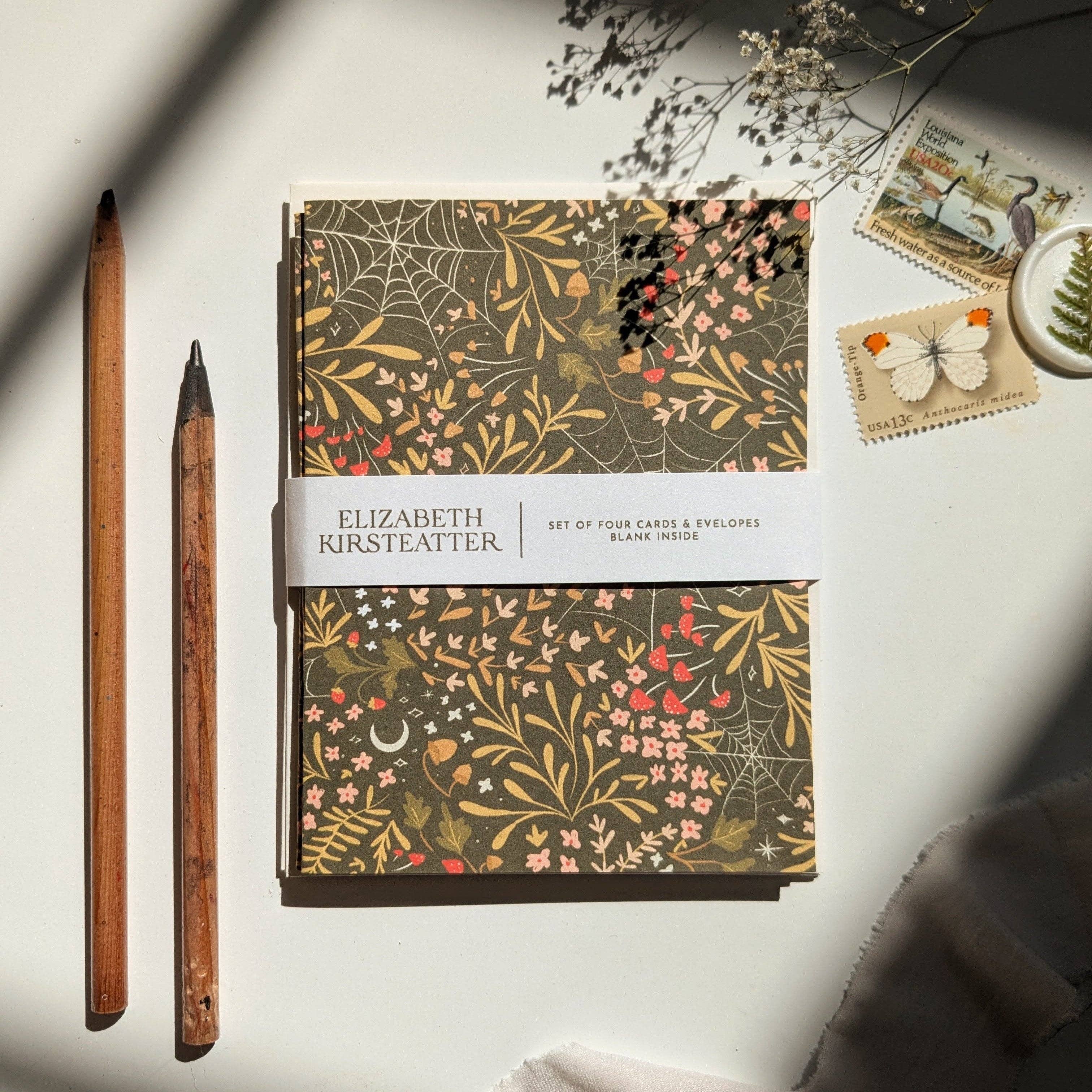 This set of notecards was inspired by moonlight autumn foraging and cottage core Halloween. Moonlit grove is the perfect whimsical botany inspired card pack. Full of fall flowers, spiderwebs, and mystical mushrooms, these cards will work for any occasion during spooky season.