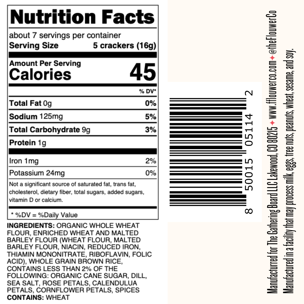2023 sofi™ GOLD AWARD WINNER! We handcraft all natural, plant-based, artisanal crackers with edible flowers and fresh herbs to give new life, flavor, and beauty to everyday grazing. No.1 is our flagship flavor. This colorful cracker is full of edible flowers as well as garden herbs like woody rosemary, fresh dill, and a burst of chive. This colorful and savory cracker is well deserving of space on any charcuterie board. Case of 12 x 4 oz. retail boxes. Individual retail box 5"x2.5"x5". FSC-certified paper box. *The perfect gift for the foodie, the gardener, the hostess, the bride & bridesmaids in your life. This product is also perfect inside corporate gift baskets and curated gift boxes and bundles. great at any book or stationary store, food market, garden and home goods shop, gift store or in a cocktail/bar tools section. **Expect to find plant matter in our products.