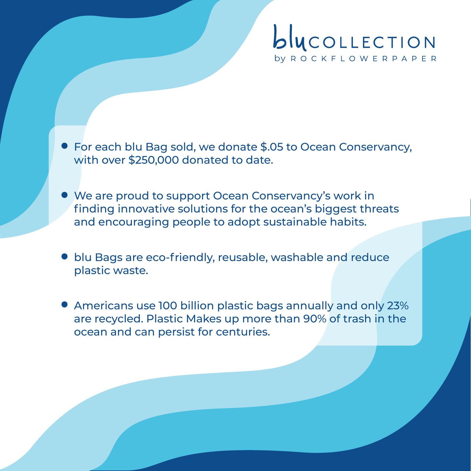 Our #1 seller! The blu Bag Reusable Shopper bag has become an everyday lifestyle essential for people everywhere. Designed to serve as the perfect shopper for market runs, our range of patterns and colors are also purchased as fun fashion tote bags and 'spares' for travel. FREE display box with purchase of any 36 blu Bags – add item #BB-DISPLAY36 to your order. • durable for maximum reusability – 100% polyester • 19 x 24 inches – 1 bag holds the contents of 3 single-use plastic bags • strong - carries up to 50 lbs • machine wash; dries quickly • compact size stashes everywhere • free display box: heavyweight cardboard, 13.5” L x 9” W x 2.5” D. We donate 5 cents per bag to Ocean Conservancy for every Blu Bag Reusable Shopper sold.
