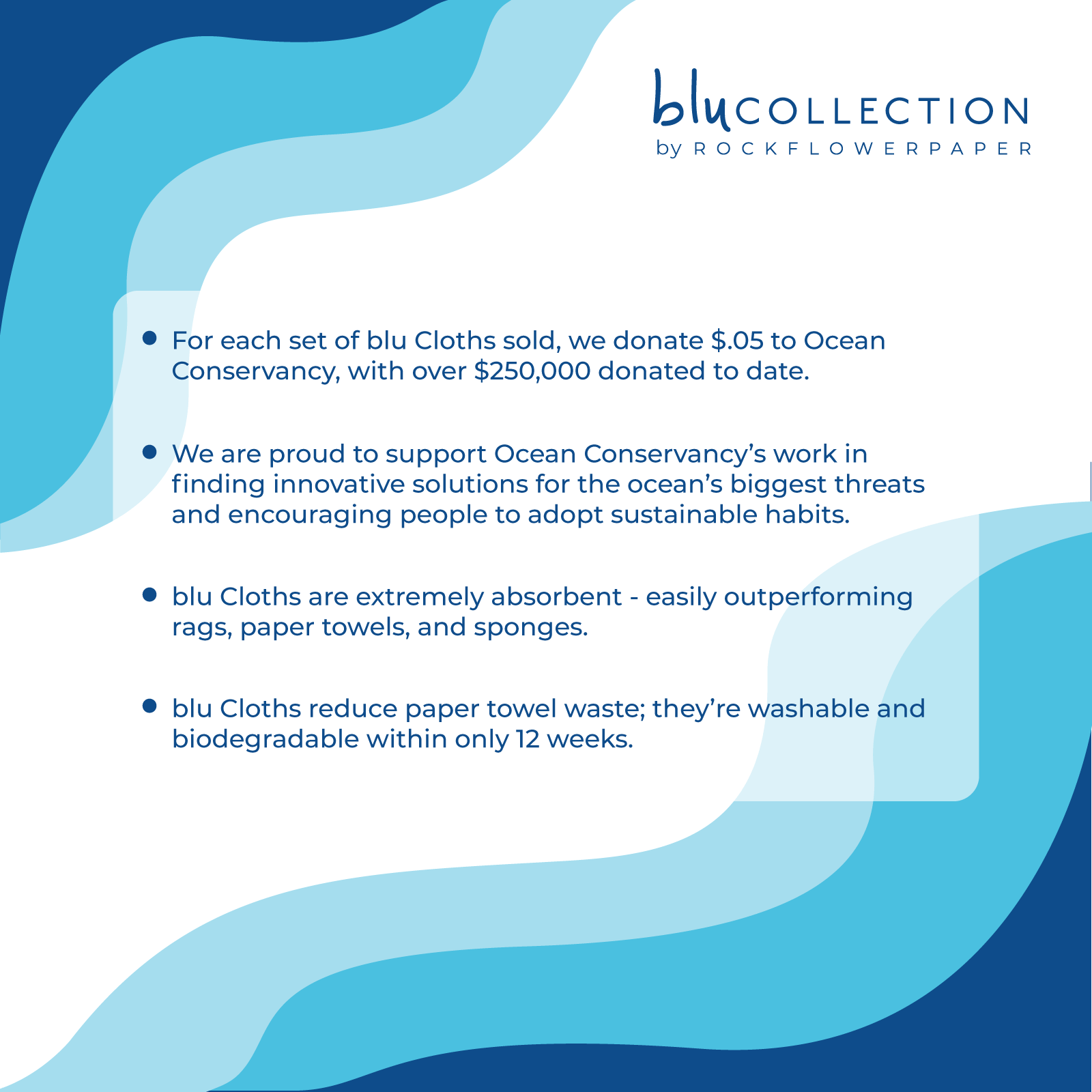 We're all looking for useful green alternatives for everyday living. This 'absorbs like a sponge-feels like a cloth' multi-purpose innovation is excellent at tackling any job that a cloth, sponge or paper towel is used. Strong enough to be washed (up to 50x), reused over and over, and 100% compostable so they don't hang around when they're done! FREE display box with purchase of any 36 blu Cloths – add item #BC2-DISPLAY36 to your order. • 70% cellulose – 30% cotton • 8 in x 7 in • 100% biodegradable – 100% compostable • Sold in a set of 2 with attached merchandising header • free display box: heavyweight cardboard, 14” L x 8.5” W x 4” D We donate 5 cents per bag to Ocean Conservancy for every Blu Cloth Eco Sponge Cloth set sold
